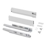 Comprend: deux côtés latérales, un ensemble de guides à fermeture amortie, un ensemble de couvre-garnitures et des attaches avant de tiroir.