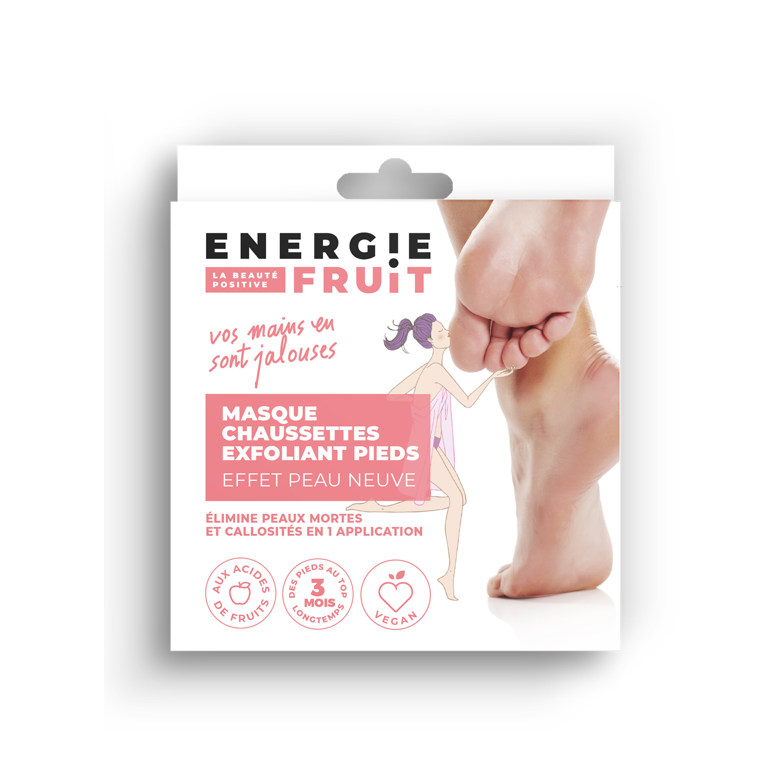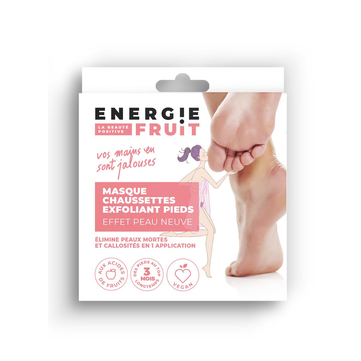 EFFET PEELING Le masque-chaussette SOS Pied exfoliant régénère la peau en profondeur et élimine les peaux mortes et rugosités en une seule application. Un format 100% pratique et malin pour des pieds exfoliés, gommés et doux pour plusieurs mois ! Attention : ce produit contient de l'alpha hydroxyde d'acide (AHA), ce qui peut augmenter la sensibilité de votre peau et accentuer la possibilité de coup de soleil. Utilisez des crèmes solaires adaptées à la carnation de votre peau. Masque chaussette exfoliant Energie fruit