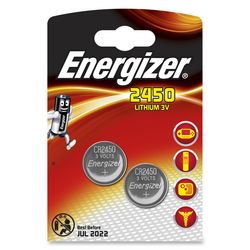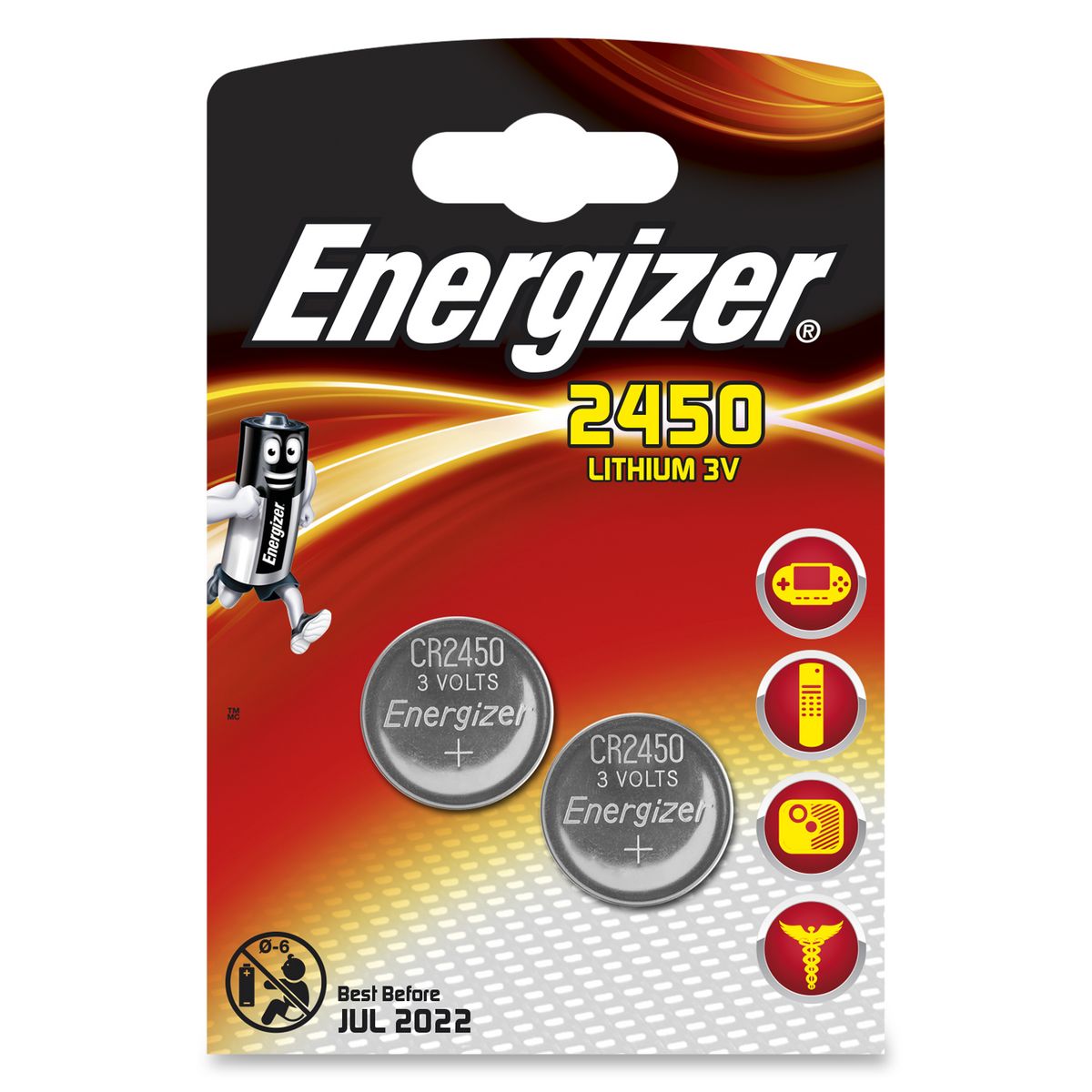 Type de pile d'alimentation: BoutonNom du produit: Lot de 2 pilesNom des piles: CR2450Marque du produit: ENERGIZERFréquence d'utilisation: IntensifTension (en V): 3Capacité (en mAh): 620Nombre de piles: 2Préchargé: OuiProduit emballé : poids (en kg): 0.017Produit emballé : profondeur (en cm): 0.6Pro
