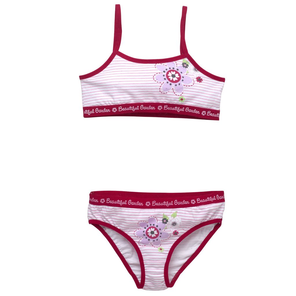 On adore ce joli ensemble brassière culotte, spécialement conçu pour les petites filles. Un ensemble tout doux et confortable, composé à 96% de coton et à 4% d'élasthanne. Maille douce et élastique. Bande élastique à la base de la brassière, et à la ceinture de la culotte. Jolis imprimés rayures et