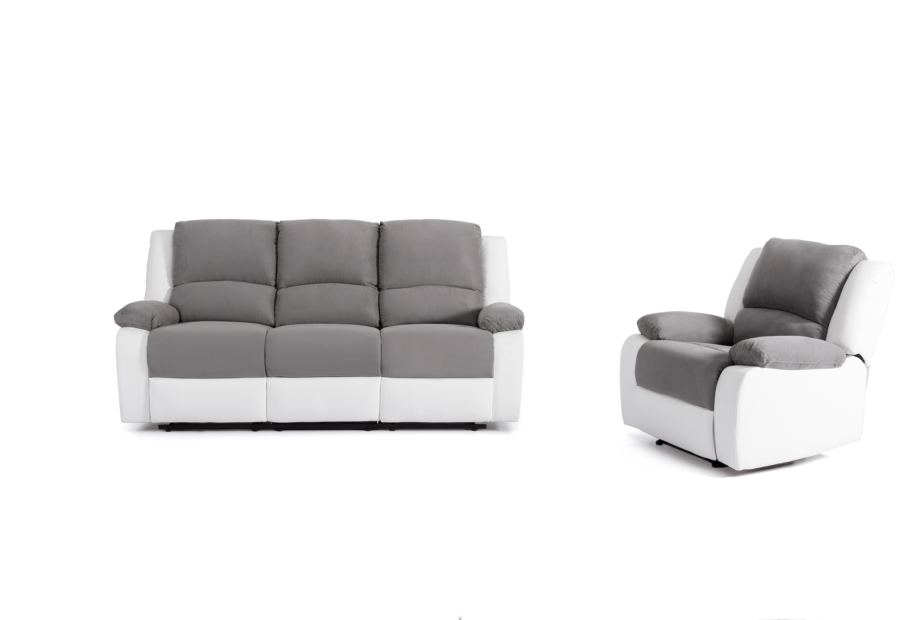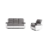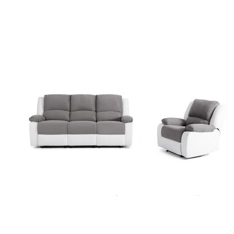 Vous recherchez un ensemble canapé et fauteuil relax cosy ! Le voici ! Le canapé 3 places, doté de deux relax, accompagné de son fauteuil relax permettront à votre petite tribu de se détendre en regardant un bon film. Le revêtement bi matière polyuréthane tissu et bicolore gris/blanc, facile d'entretien, vous apportera satisfaction. Craquez !