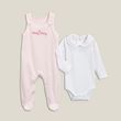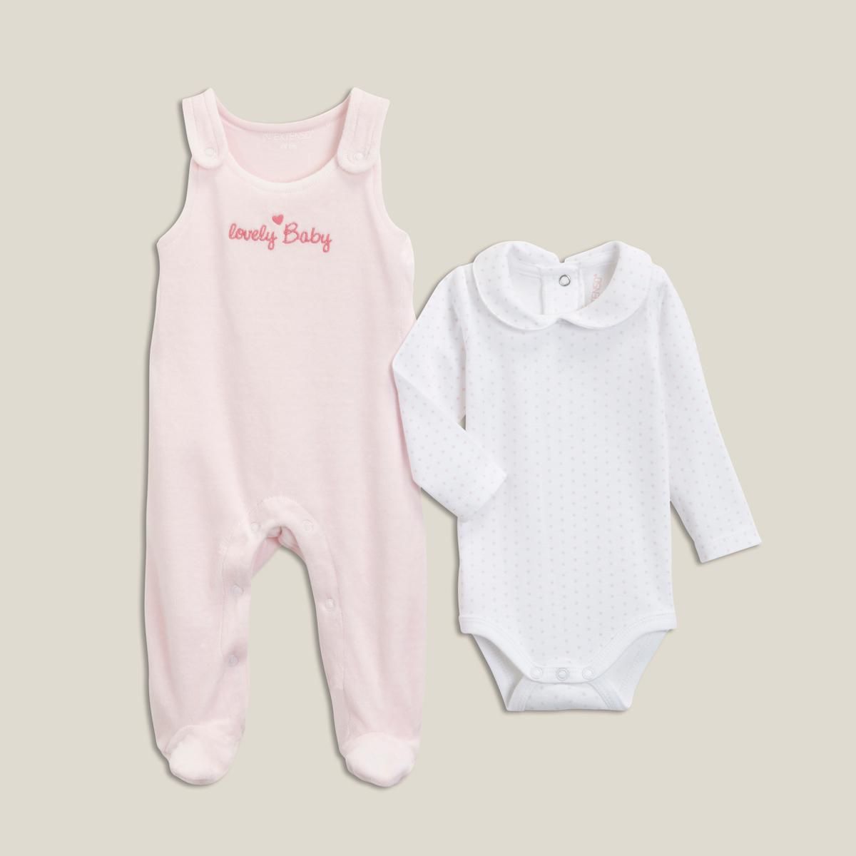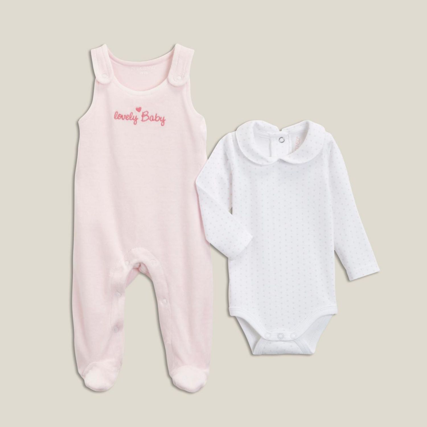 Place à la douceur et au confort avec cet ensemble combinaison et body bébé fille. Combinaison sans manches. Velours lisse. Toucher doux. Bretelles fermées par pression. Ouverture pressionnée sur les côtés et à l'entrejambe. Broderie sur le devant. Body imprimé. Col claudine. Manches longues. Pressi