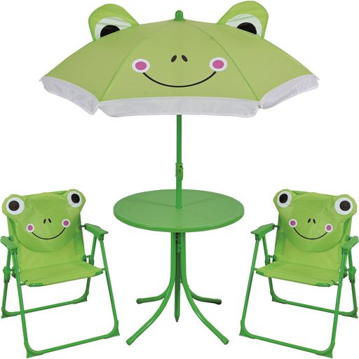 Le kit complet pour que votre enfant ait aussi son petit coin farniente : deux chaises, une table, un parasol ! Le tout ambiance grenouille pour satisfaire garçons et filles !