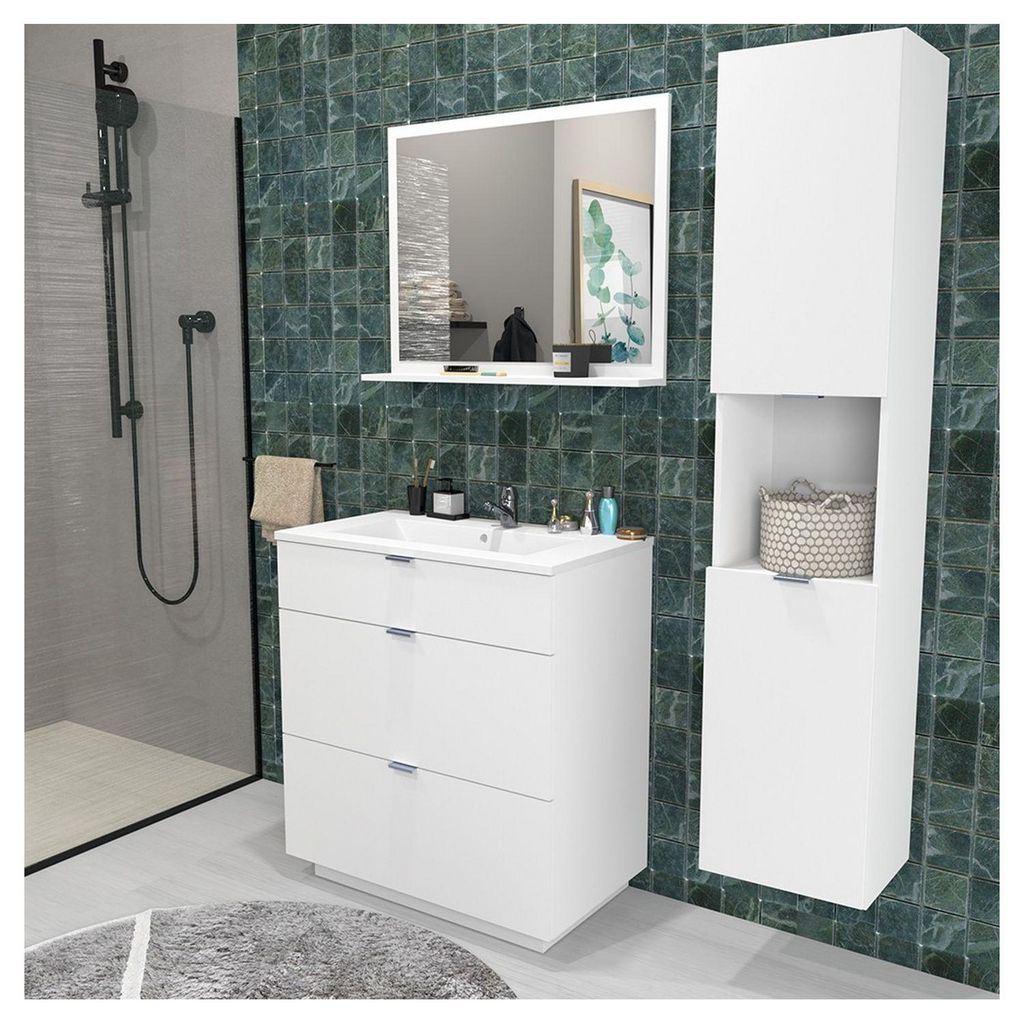 L'ensemble de salle de bain FARO propose un meuble sous vasque avec 3 tiroirs, une vasque en résine blanc brillant, un miroir et une colonne assortie. Fabriqué en Union européenne avec des panneaux de particules surfacés mélaminés, il présente des poignées métalliques pour une finition moderne. La couleur blanche ajoute une touche élégante à votre salle de bain.