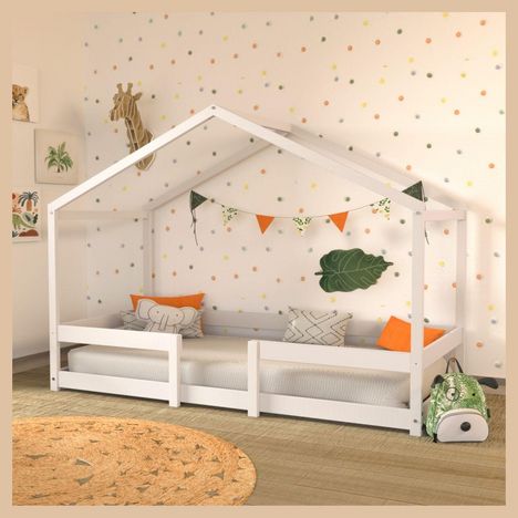 Lit cabane 90x190 cm en bois massif avec sommier et barrière de protection FLORIDA