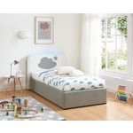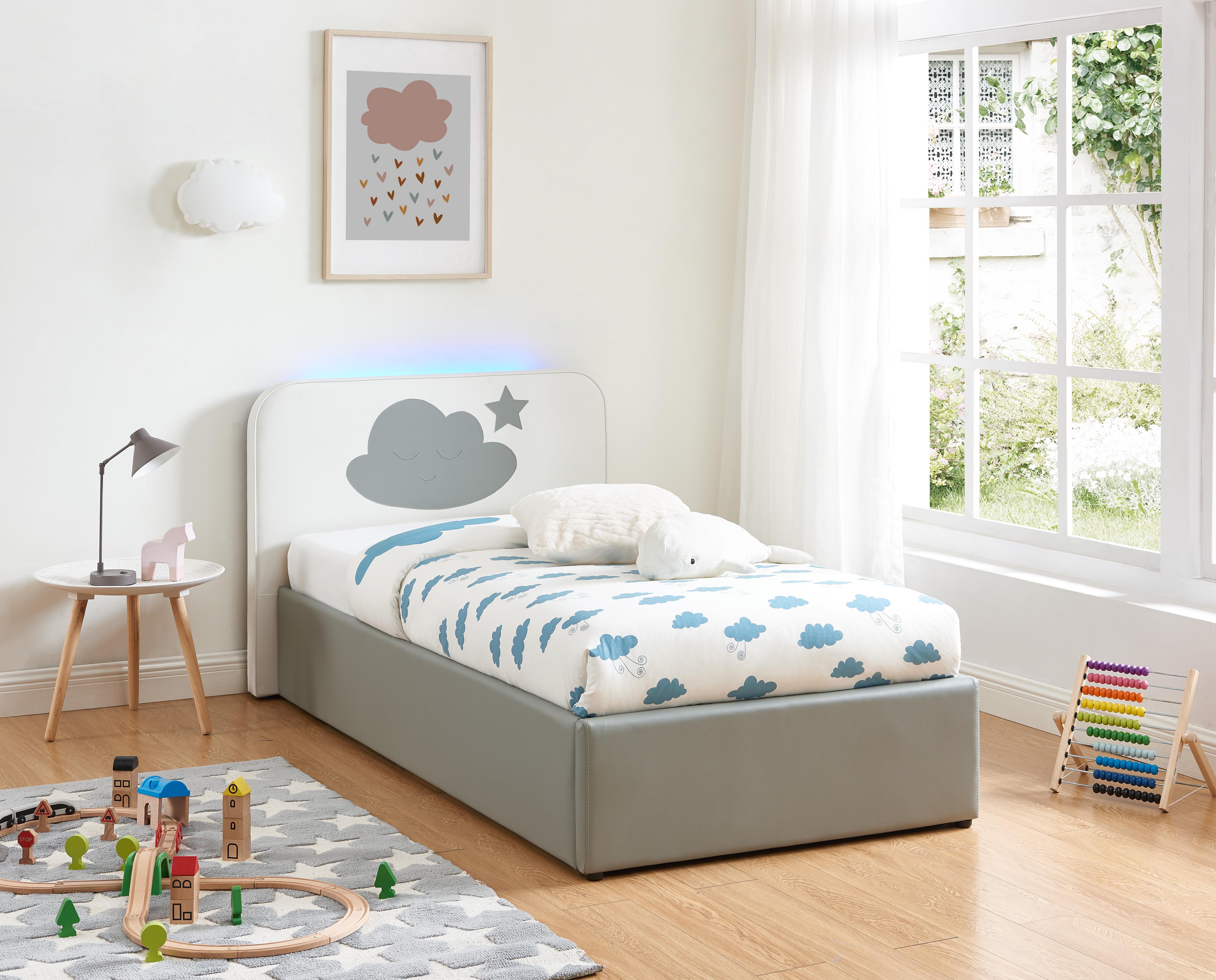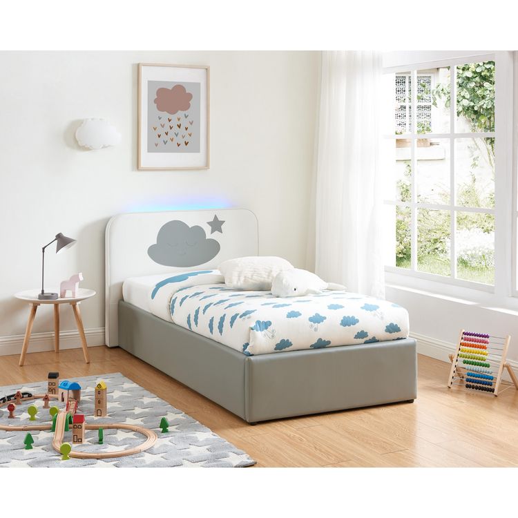 Lit coffre enfant NUAGE avec LED - structure en bois et en contreplaqué - revêtement PVC gris et blanc - sommier relevable à lattes 90x190cm inclus - dimensions : l110 x P205 x H90cm