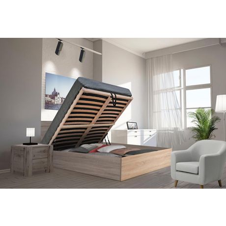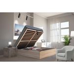 Lit coffre de coloris blanc ou chêne avec une structure en panneaux de particules finition mélaminé.