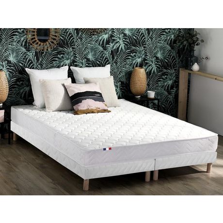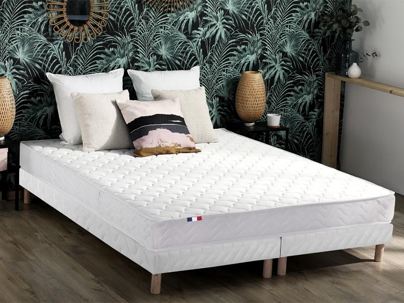L’ensemble Toulon, l’assurance de bien dormir. Le matelas est composé d’une âme de 10cm en mousse 25kg/m3, de 2 cm de latex alvéolé 63 kg/m3, de garnissage hypoallergénique et matelassé sur les 2 faces de 0.5 cm de mousse de confort 25 kg/m3 et de 200g de ouate anallergique. Au niveau du couchage, il offre un accueil équilibré et un soutien ferme, 3 zones de soutien son différencié pour un confort optimal. Avec ses deux faces de couchage, il vous accompagnera au fil des saisons ! Le coutil est en tissu certifié Oekotex100 et se compose de 77% de polyester et de 23% de polypropylène. Pour un couchage sain, il est traité anti-acariens et anti-bacteriens. Le sommier structure bois dispose de 12 lattes de 10 cm d'épaisseur matelassé avec 5 mm de mousse pour améliorer le confort. 4 pieds cylindriques en bois naturel d’une hauteur de 12 cm sont fournis. Fabrication Française !