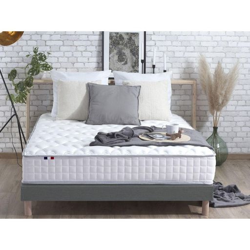 Laissez-vous tenter par ce superbe ensemble literie Cosmos pour de bonnes nuits de sommeil! D’une épaisseur de 24 cm, le matelas Cosmos vous offre un accueil équilibré et un soutien ferme. Il est composé de 672 ressorts ensachés avec 7 zones de couchage différenciés de fermeté pour une réelle ergonomie : Tête / Épaules / Lombaire / Bassin / Cuisse / Jambes / Pieds. Il dispose de 2 faces de couchage, une face hiver : 5 mm de mousse + 200 g/m2 ouate hypoallergénique + 400 g/m2 de demi laine (côté bandeau) et une face été : 5 mm de mousse + 200 g/m2 ouate hypoallergénique + 300 g/m2 de coton. Livré avec 1 sommier déco en bois massif de 12 lattes rigides et 4 pieds de 12 cm en bois brut. Fabrication française