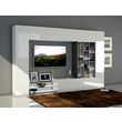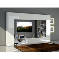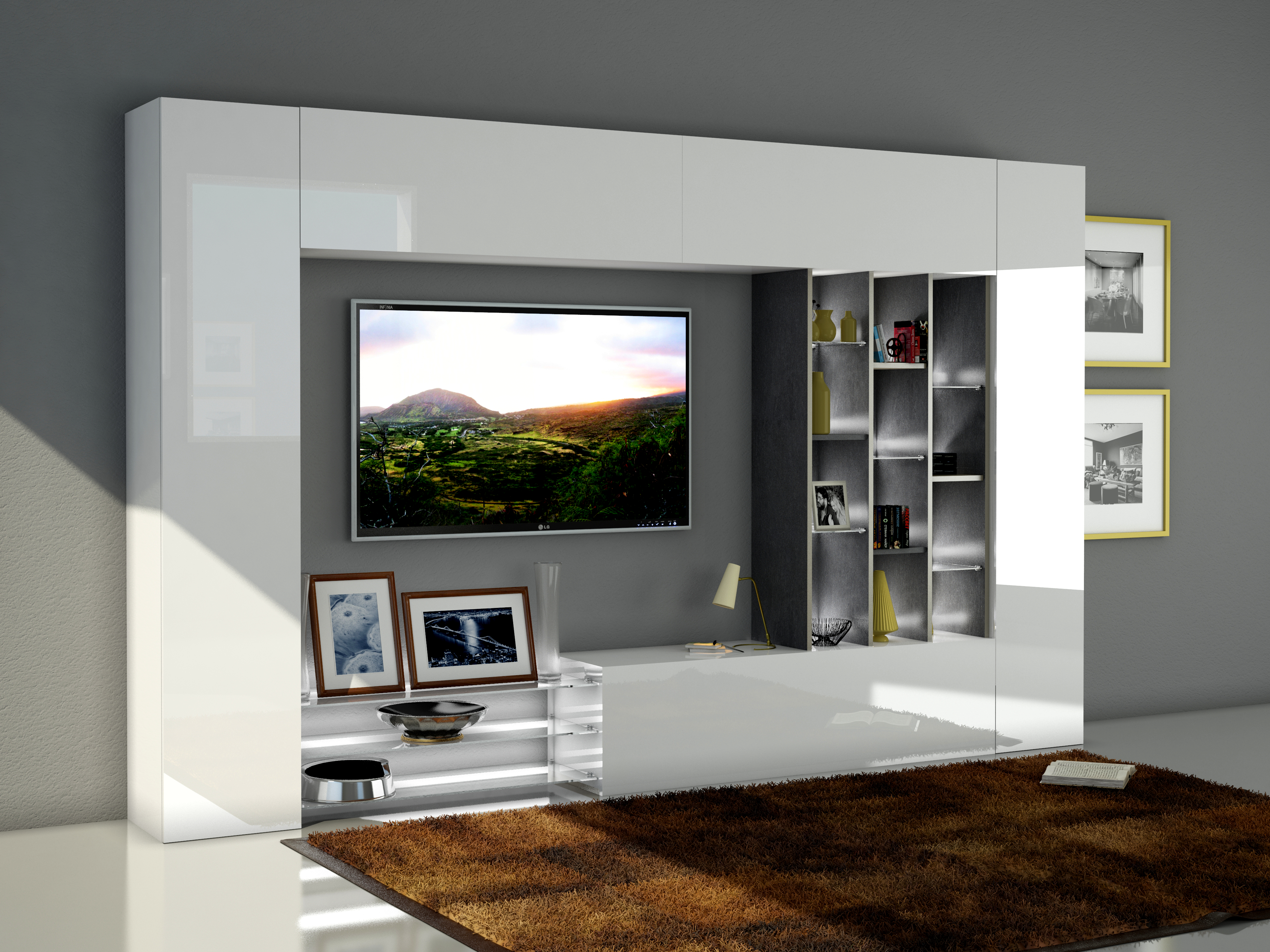 Ensemble tv avec une structure en panneaux de particules ép.16 mm; façades laquées en melamine laqué. Composé de 2 meubles suspendus 1 porte, 1 meuble TV 1 porte abattant, 2 colonne 1 porte avec 2 étagères, 1 bibliotèque 9 niches (8 étagères dont 4 en verre), 3 étagères en verre.