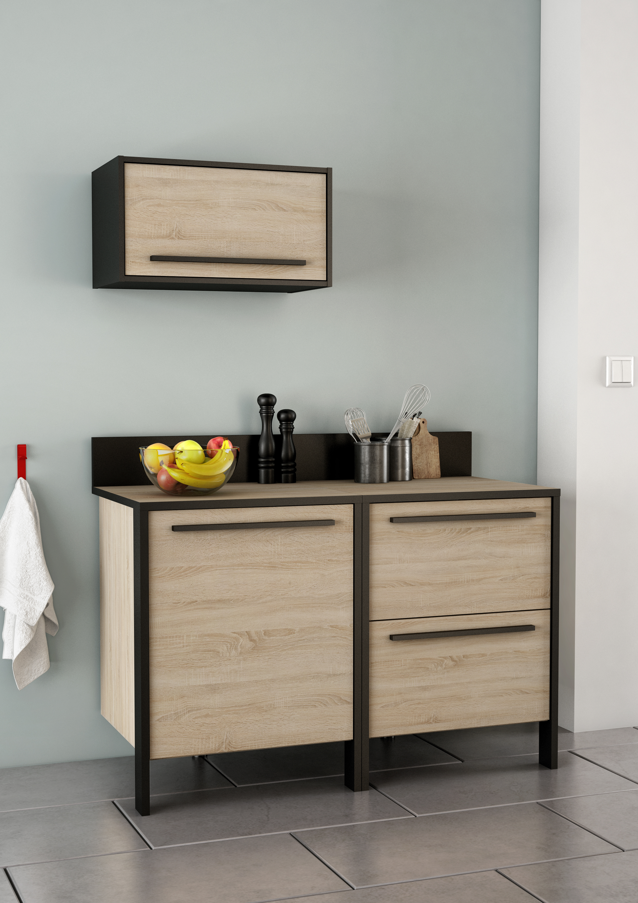 Ensemble meubles de cuisine bas sous évier 1 porte L64cm + bas 2 tiroirs L64cm + haut 1 porte L64cm BRICKHOUSE