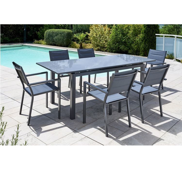 En savoir +Le salon de jardin Malaga est idéal pour profiter de son jardin ou de sa terrasse en toute convivialité.Il peut recevoir jusqu'à 6 personnes. Ce salon de jardin allie qualité et esthétisme grâce à son aspect résine tressée très réussi. Dimensions : -Table Malaga 160x210x90x76 cm Structure aluminium grise, allonge automatique, plateau verre lisse teinté -Fauteuil Malaga 55x57x85 cm Structure en aluminium grise, empilable, assise et dossier en textilène matelassé gris