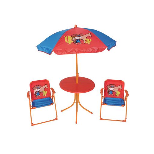 L'ensemble de salon de jardin proposé par la marque CIDDECO est composé d'une table, de 2 chaises, et d'un parasol. Il est conçu avec une structure en acier et les assises en polyester. Ce salon de jardin saura séduire vos enfants grâce à son effigie de cowboys et son ambiance western qui les protég