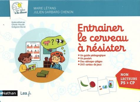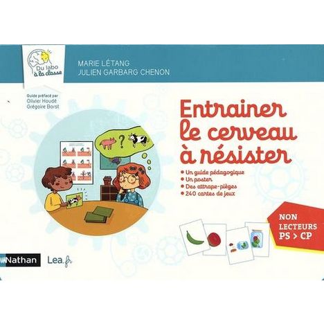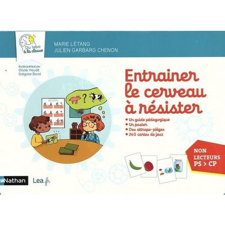Entrainer le cerveau à résister, une méthode innovante pour favoriser les apprentissages et éviter les erreurs courantes avec le coffret pour les élèves de PS, MS, GS, et CP : des activités pour entraîner efficacement les élèves au contrôle inhibiteur. L'inhibition c'est la capacité de notre cerveau à résister aux habitudes, automatismes, tentations et distractions. C'est le signal STOP qui permet à l'enfant d'apprendre à s'arrêter s'il va trop vite dans sa réflexion et de ne pas tomber dans un piège. Cette méthode issue des recherches menées par le LaPsyDE, testée et validée sur Lea. fr , propose un entrainement à l'inhibition. Le coffret contient : un guide pédagogique, 240 cartes pour s'entrainer, un poster sur le fonctionnement de l'inhibition et 5 attrape-pièges. Le guide pédagogique est structuré en 4 parties : - Une introduction pour l'enseignant sur le fonctionnement du cerveau, les éléments théoriques et les principes pédagogiques. - A la découverte de mon cerveau : 2 séquences (différenciées PS/MS, GS/CP) pour faire découvrir aux élèves le cerveau en tant qu'organe d'apprentissage et introduire le projet d'entrainement au contrôle inhibiteur. - Champion de l'inhibition : 38 activités pour s'entrainer à inhiber. - La chasse aux pièges : un dispositif ( l'attrape-piège ) pour aider les élèves à inhiber des heuristiques préalablement identifiées. OFFERT avec cet ouvrage : 1 mois d'abonnement à Lea. fr Existe également en version guide pédagogique seul : Vous pouvez également acheter le guide pédagogique seul et télécharger gratuitement les cartes, le poster et les calques sur Lea. fr. Plus d'information ici ! Retour d'enseignant sur l'ouvrage : - Voici mon retour sur l'ouvrage Entraîner le cerveau à résister'' @editions. nathan pour les élèves de PS au CP. J'espère que cette petite présentation pourra vous donner quelques pistes. Pour ma part j'ai adoré ! La présentation se trouve dans les photos.
