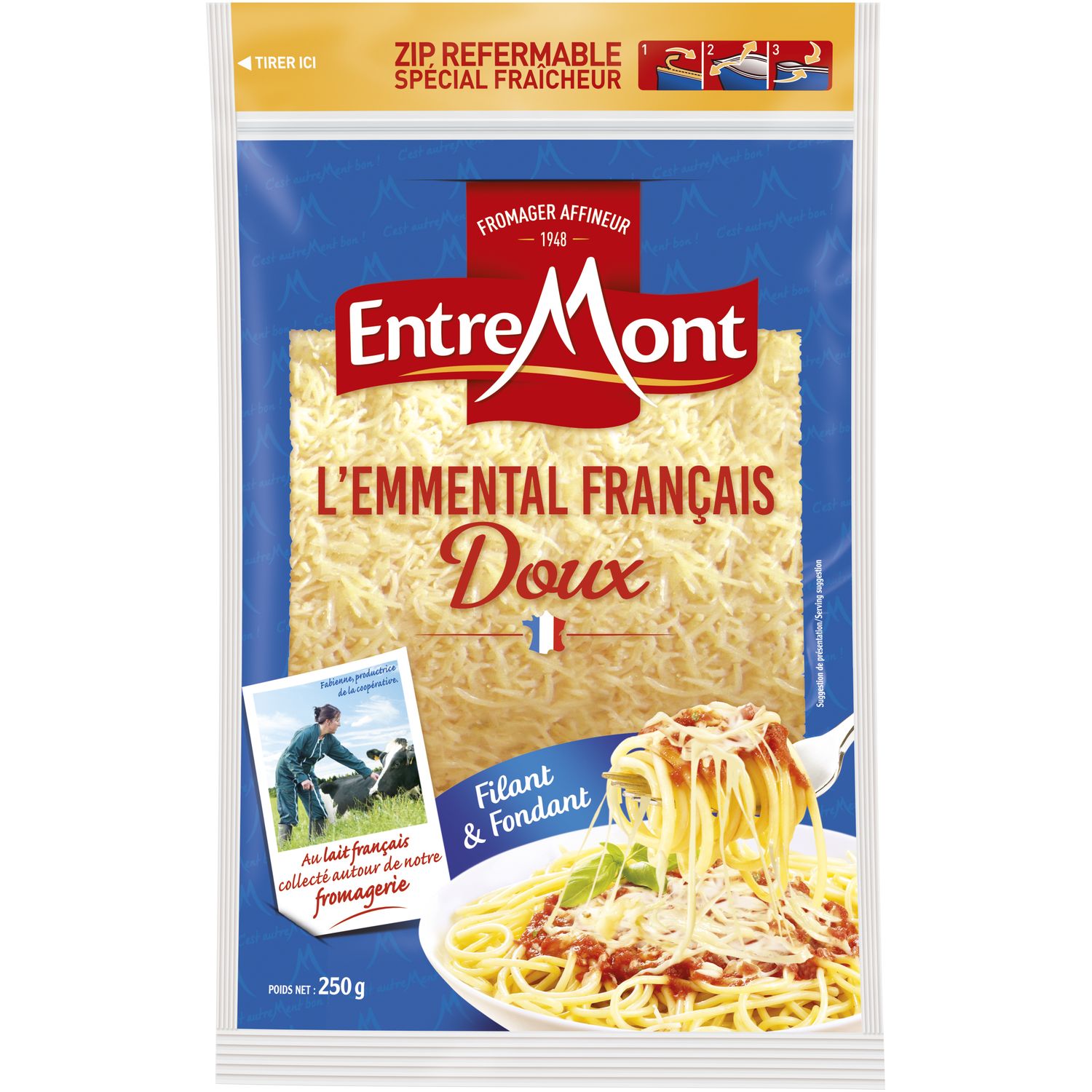 Un lait récolté dans les fermes situées autour de notre fromagerie pour un râpé issu de meules de qualité : Un Emmental Français doux à la texture filante. Fromage à pâte pressée cuite