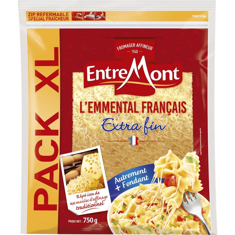 Notre Emmental Français est râpé extra fin pour plus de fondant et c'est son affinage traditionnel en cave qui lui donne son goût si unique. C'est Autrement Bon! fromage à pâte pressée cuite