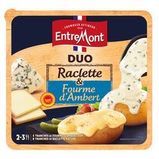 Avec le Duo Raclette Nature et Fourme d'Ambert AOP Entremont, le terroir s’invite dans vos assiettes. Découvrez l’association unique de la raclette nature douce et onctueuse, avec une Fourme d'Ambert au bon goût fromager: fromage AOP qui détient une texture fondante et crémeuse à chaud!