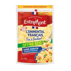 Pourquoi l'Emmental Français râpé Entremont est Autrement Bon ? Il est issu de meules au bon goût fruité fabriquées avec du lait Français. L'Emmental râpé Entremont possède des brins fins pour encore plus de fondant ! 100% Emmental : de l'Emmental râpé et rien d'autre !