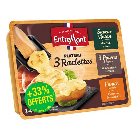 Un assortiment de 3 Raclettes Entremont pour varier les plaisirs. La raclette Saveur d'Antan, une raclette nature au goût authentique et à la texture onctueuse grâce à sa recette au lait entier. La raclette 3 Poivres, une raclette subtilement relevée. La raclette Fumée traditionnellement au Bois de Hêtre. Affinée 8 semaines sur planche d'épicéa, les raclettes Entremont sont l'incontournables de vos moments raclette pour encore plus de plaisir et de gourmandise.