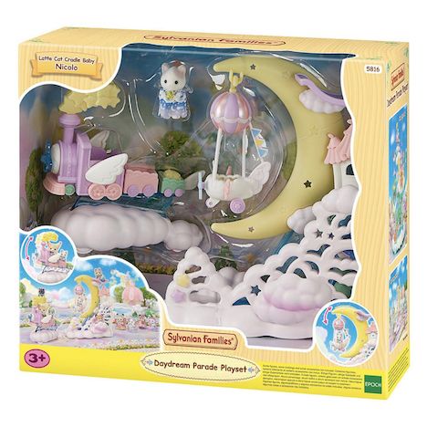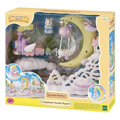 Le bébé Chat Latté ouvre les portes du monde des rêves. Connecte le train et la lune pour les faire rouler ensemble, ou joue séparément avec la lune et le train. Tourne la molette pour faire bouger la lune. Le vaisseau du bébé Chat Latté se décroche de la lune et peut être utilisé séparément. Fais monter et descendre le train autant que tu le souhaites. La parade des rêves contient le bébé Chat Latté.