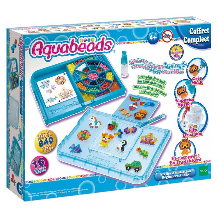 Avec Aquabeads, le principe est simple : assemble les perles, vaporise de l'eau, retourne ta création avec le Flip Tray et c'est prêt ! Ce coffret comprend plus de 840 perles et de nombreux modèles de création comme des animaux (lion, papillon, cheval, oiseau, tortue), des fruits (cerise, pommes) et