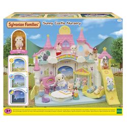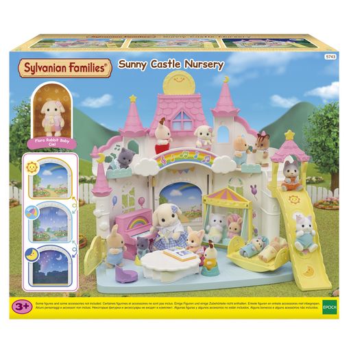 Inclus:. 1 figurine bébé Lapin Bélier, 1 structure La crèche et son socle bleu, 1 enseigne arc-en-ciel, 3 toits pointus roses, 1 arche et son toboggan, 2 lunes et 2 étoiles, 2 barrières bleues, 1 porte jaune, 1 balancelle, 1 lit à bascule , 1 table 2-en-1 (table ou toboggan), 2 sièges pour enfants, 2 sièges pour bébés, 1 piano, 1 livre. La crèche ensoleillée est l'endroit préféré des bébés Sylvanian : ils peuvent jouer et apprendre toute la journée dans cet endroit merveilleux !. Ce ne sont pas les activités qui manquent quand les bébés poussent la porte de la crèche ensoleillée et c'est le bébé Lapin Bélier qui connait le mieux chaque recoin et chaque secret. Pour les bébés artistes, il y a le piano rose et le livre à consulter assis dans l'un des confortables fauteuils autour de la table nuage. Pour les plus aventuriers, il suffit de se hisser sur la passerelle supérieure de la crèche et de glisser le long du toboggan, sensations fortes garanties !. On peut également se balancer à deux sur la balancelle ou encore faire une sieste sur le lit à bascule et son matelas intégré. Surprise ! En combinant le lit à bascule et la balancelle, on obtient un tableau sur lequel on peut dessiner au gré de son imagination. Mais ce n'est pas tout : la table nuage se plie en deux pour se transformer en un petit toboggan amusant. La crèche ensoleillée est livrée avec 1 figurine bébé Lapin Bélier et plus de 10 accessoires. Elle peut être combinée avec tout l'univers de la crèche comme le bus et sa cour de récréation, l'aire de jeu des bébés ou encore le bac à sable et piscine des bébés. Les figurines suivantes peuvent également compléter la crèche ensoleillée Sylvanian Families : le duo des bébés en promenade, le duo des bébés en habits de pluie, le trio des bébés pyjama party.