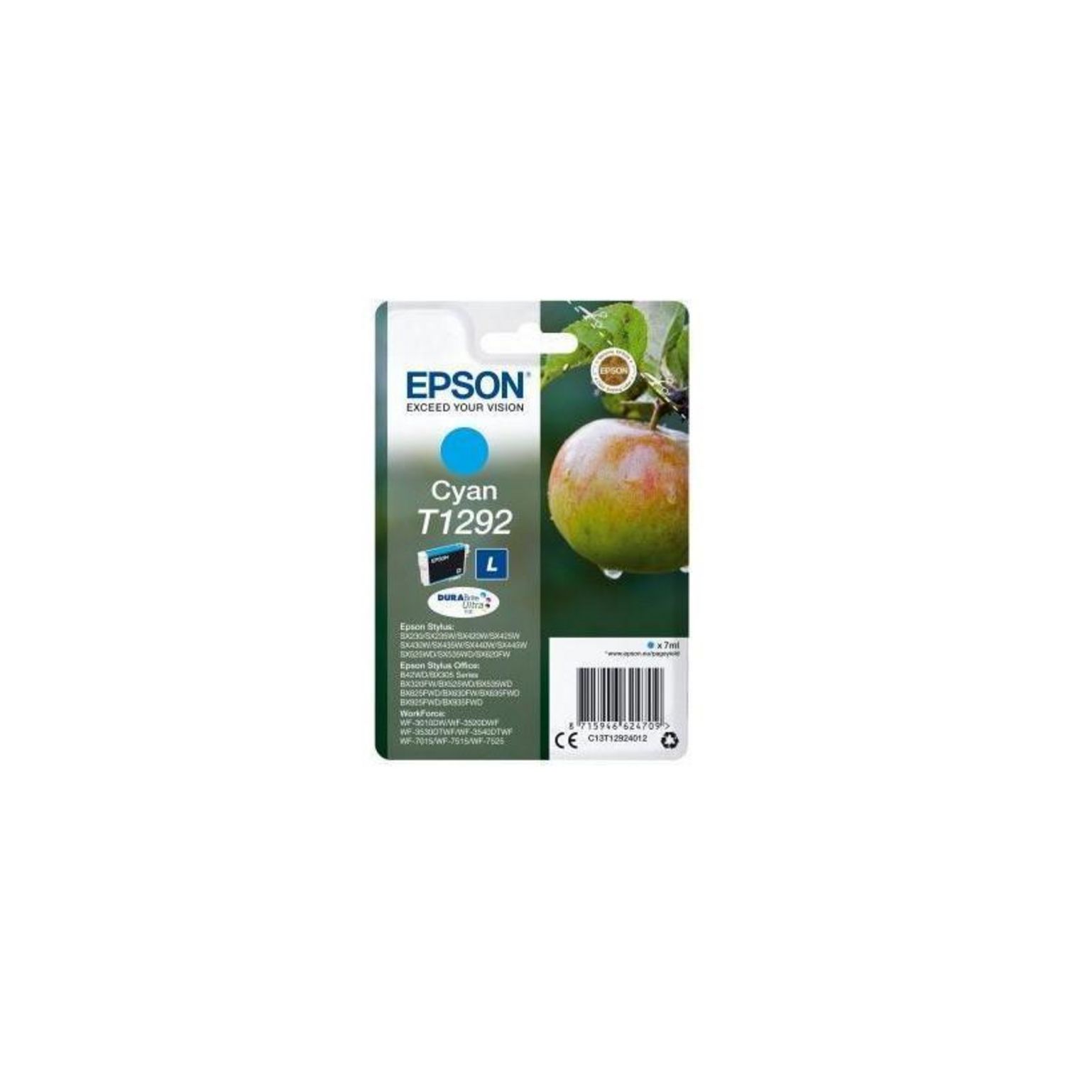 La cartouche Epson C13T12924012 (EAN 8715946624709) est une référence originale cyan conçue pour les imprimantes Epson Stylus Office et SX Series. Compatible avec les modèles B42WD, BX305F, BX525WD et bien d'autres, elle garantit une intégration parfaite et des performances optimales pour vos impressions professionnelles ou personnelles.