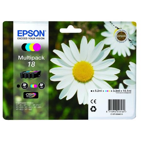 Avec le pack de cartouches d'encre EPSON "Paquerette" n°18 (Noir, Cyan, Magenta, Jaune), faites le choix de l'excellence et de la durabilité pour toutes vos impressions. Profitez de couleurs éclatantes et d'un noir profond, garantissant des résultats professionnels et des souvenirs mémorables.