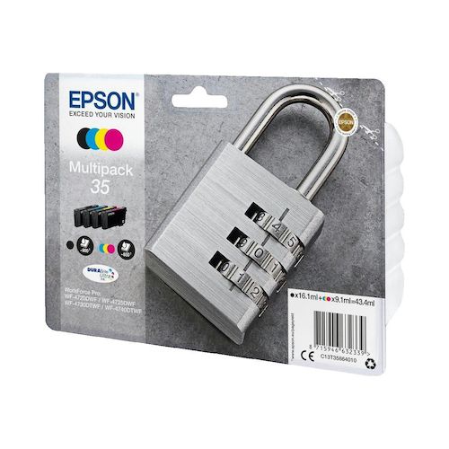 Le pack d'encre Epson Série 35 est conçu pour vos besoins d'impression professionnelle. Ce pack comprend quatre cartouches d'encre de couleurs noir, jaune, cyan, et magenta, offrant une qualité d'impression supérieure grâce à la technologie DURABrite Ultra. Chaque cartouche a une capacité de 16,1 ml