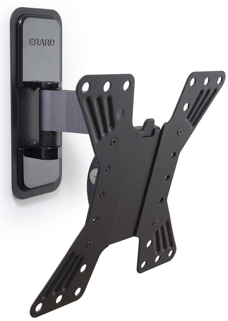 Erard 048120 Support mural Exo 200 Erard 048120 aluminium inclinable et orientable avec déport 122mm et 1 bras. Doté d'un système breveté de rondelles excentriques pour corriger les erreurs de perçage. Bras en aluminium texturé anodisé, couleur titane. Platine murale et écran en acier, peinture épox