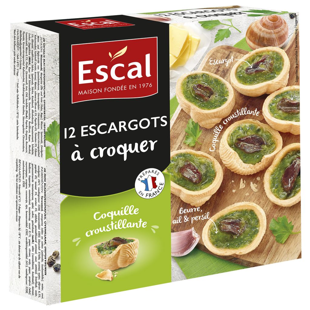 Les escargots à croquer Escal sont une variante originale et élégante des escargots à la Bourguignonne. Savoureux et fins, ils sont cuisinés de façon traditionnelle au beurre, ail, persil et échalote. Ils sont présentés dans de délicieuses coquilles craquantes. Ils se préparent très simplement en quelques minutes au four.