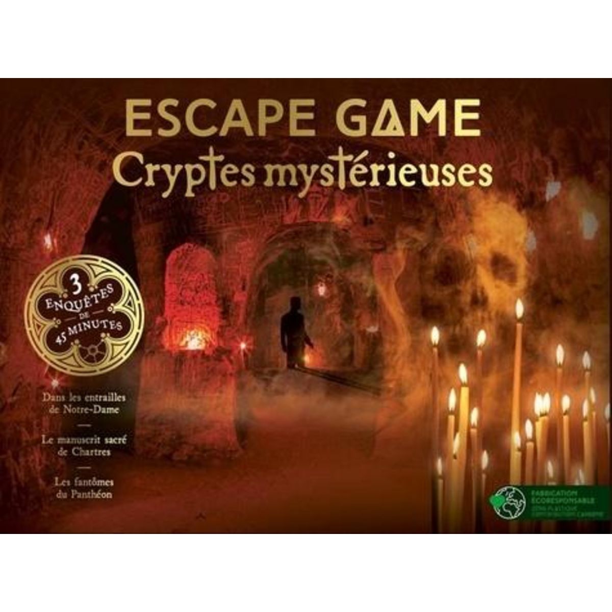 Trois scénarios haletants, au coeur de grands monuments, pour vivre des moments conviviaux, en famille ou entre amis. - Dans les entrailles de Notre-Dame. Touristes de passage à Paris, vous visitez la crypte archéologique de Notre-Dame lorsqu'une alarme stridente se déclenche. Le public doit être évacué de toute urgence ! Dans la confusion générale, vous vous retrouvez enfermés dans la crypte, suite une erreur des vigiles. Prisonniers de l'île de la Cité, au coeur des vestiges de Lutèce, il vous faudra effecteur un long voyage à travers les siècles pour espérer revoir la lumière du jour. Un voyage qui s'annonce riche en péripéties et en rebondissements... - Le manuscrit sacré de Chartres. Vous et votre équipe de restaurateurs de monuments historiques visitez l'imposante crypte de la cathédrale de Chartres quand un incendie se déclare dans la charpente. C'est la panique ! Une légende raconte qu'un précieux manuscrit comporterait une formule magique qui protègerait les lieux de pèlerinage de tous les dangers. Ce manuscrit serait dissimulé dans la crypte. Réussirez-vous à mettre la main dessus avant que le feu ne ravage l'édifice ? - Les fantômes du Panthéon. Vous êtes un groupe de choristes et vous animez une cérémonie au Panthéon de Paris. A la fin de votre prestation, vous vous apercevez qu'un des ténors de votre groupe manque à l'appel. Inquiets, vous partez à sa recherche et descendez dans la crypte. Son sac gît par terre, abandonné devant l'un des caveaux. Votre camarade semble s'être volatilisé. Parviendrez-vous à résoudre le mystère qui accompagne son étrange disparition ?
