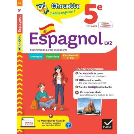 Voici ce que tu trouveras dans ton cahier Espagnol 5e : les points clés du cours , un entraînement ciblé , des jeux et activités en VO , tous les corrigés dans un livret , un reportage photo pour découvrir la vie quotidienne en Espagne.