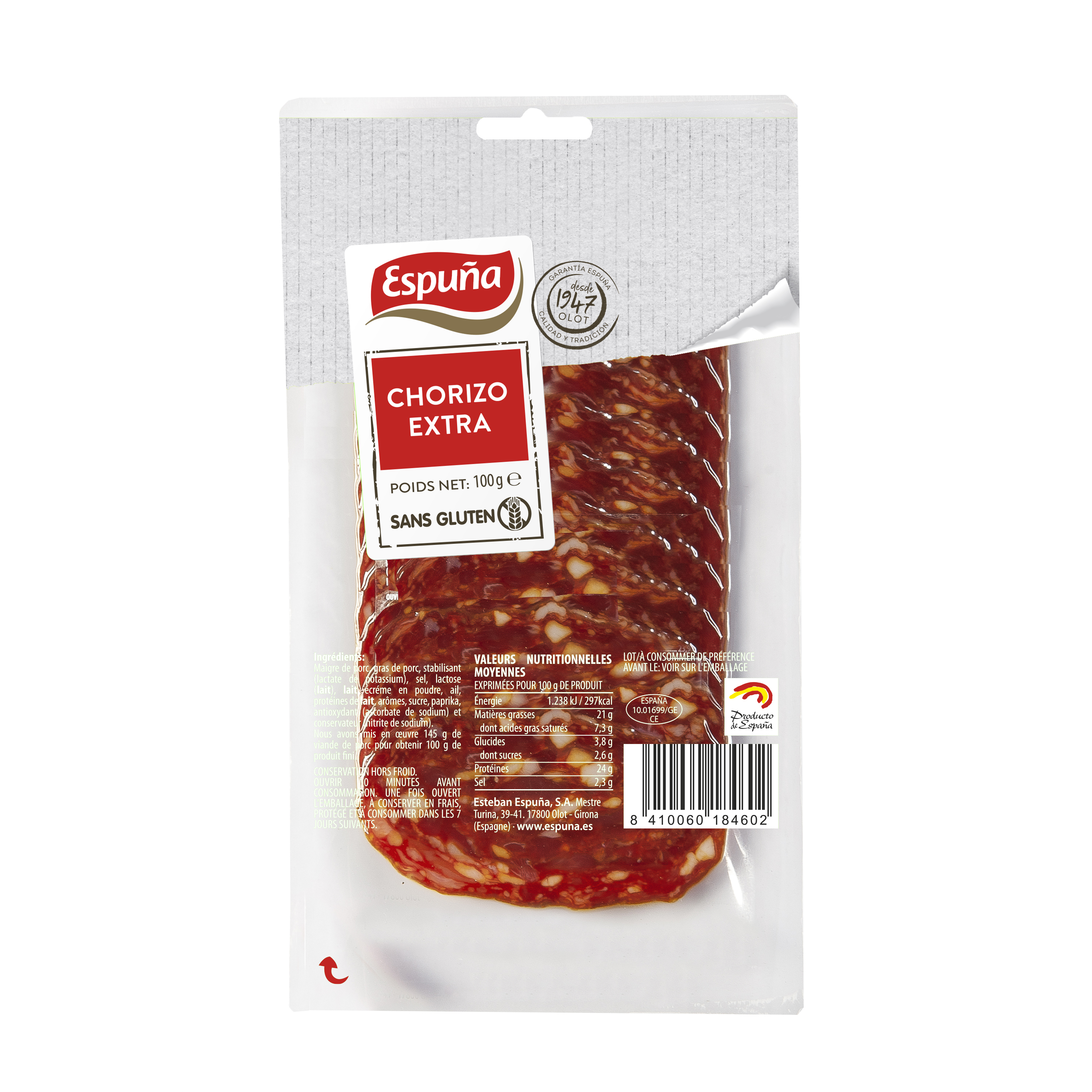 Ingrédients : Viande de porc, protéines de porc, farine de riz, sel, paprika, dextrose, dextrine, sucre, ail, stabilisant (triphosphate de pentasodium), huile d'olive, arôme de fumée, arômes, conservateurs (nitrite de sodium, nitrate de potassium) et épices.