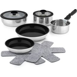 Contenu du set | 2 casseroles de 16cm et 18cm de diamètre 2 poêles de 22cm et 26cm de diamètre 1 sauteuse de 24cm de diamètre 2 couvercles de 18cm et 24cm de diamètre + 1 poignée amovible et 2 protections en feutre pour les poêles. | |