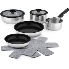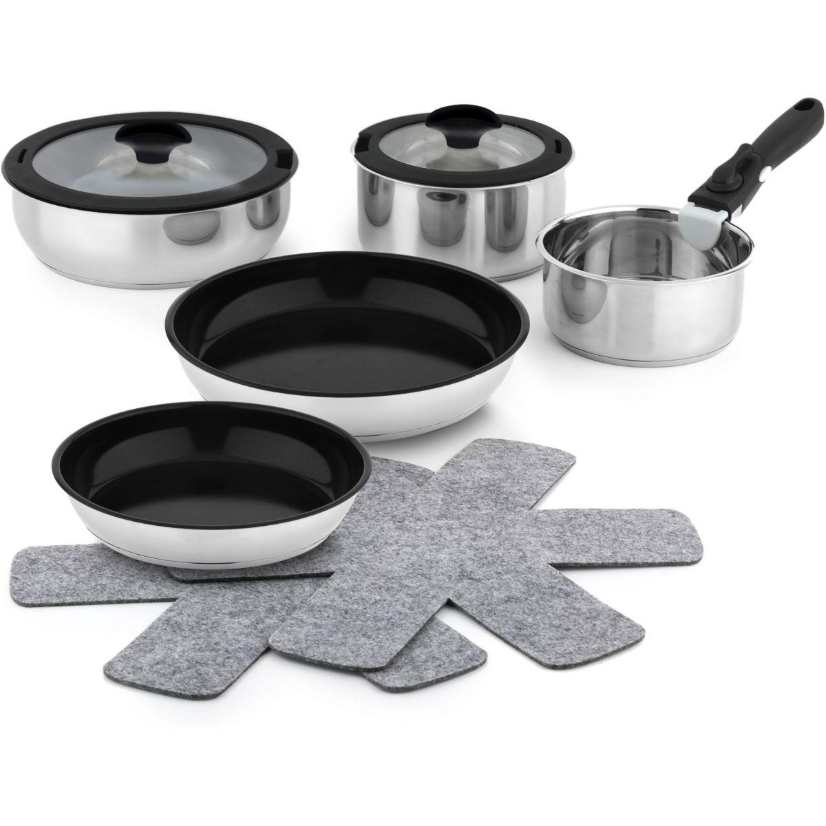 | Contenu du set | 2 casseroles de 16cm et 18cm de diamètre 2 poêles de 22cm et 26cm de diamètre 1 sauteuse de 24cm de diamètre 2 couvercles de 18cm et 24cm de diamètre + 1 poignée amovible et 2 protections en feutre pour les poêles. | |