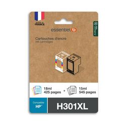 Caractéristiques générales Consommable Pour imprimante jet d'encre Type de produit 2 cartouches encre XL Référence cartouche / toner 301XL Nombre de pages moyenne 404.0 Marque compatible HP Cartouche compatible Essentiel B Coloris Coloris Noir, Cyan, Magenta, Jaune