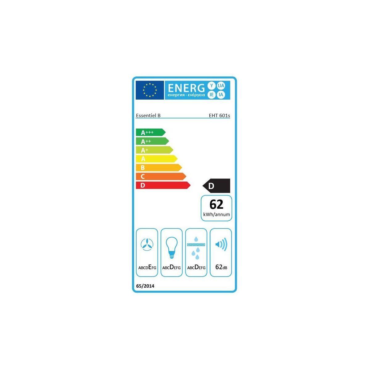 Consommation d'énergieClasse d'efficacité énergétique: D, Consommation annuelle d'énergie en kWh: 62 kWh, Classe d'efficacité d'évacuation de la vapeur et fumées: E, Classe d'efficacité de l'éclairage: D, Classe d'efficacité de filtration des graisses: D