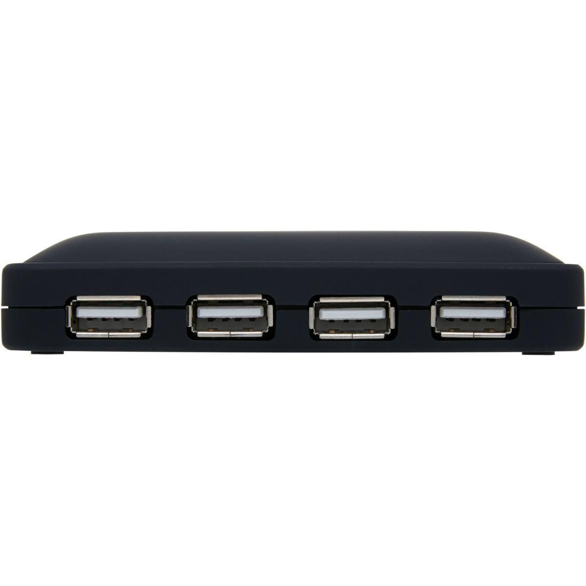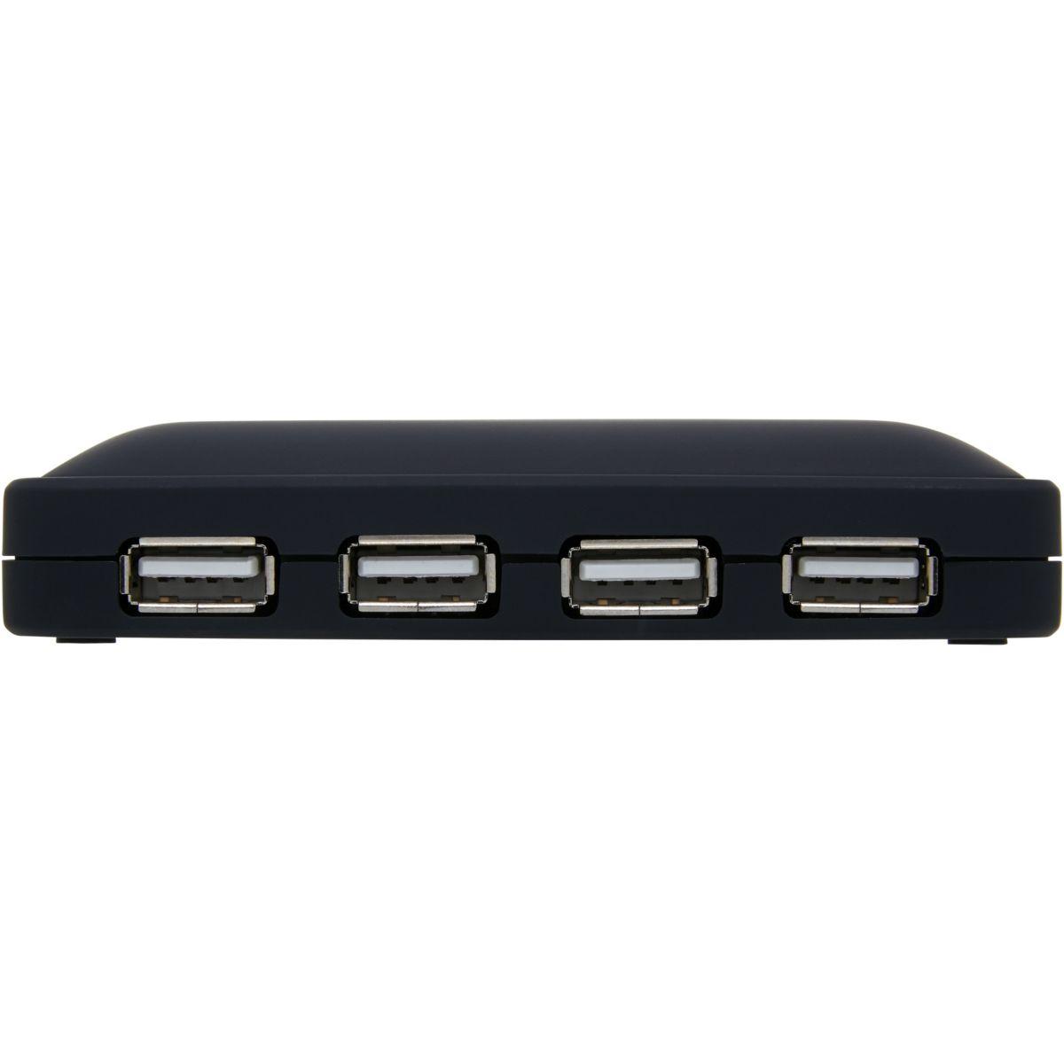 Se connecte sur un USB-A et en propose 7 pour brancher des périphériques divers (je n'ai pas personnellement dépassé 3). Petit plus avec une alimentation externe branchée au hub et qui fournit un surcroît de courant appréciable pour les périphériques (par exemple disque dur, lecteur cd/dvd,...). L'alimentation a une prise coaxiale spécifique, sans doute pour éviter toute erreur de branchement.