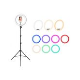Appareil photo : Non J'éclaire : Oui Avantages : Lumière réglable : 3 modes de couleurs blanches et 7 modes de couleurs. Livré avec : Trépied, support smartphone, télécommande filaire