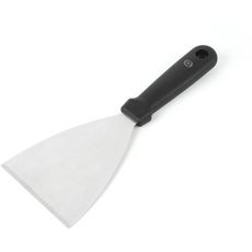 Parfait pour une plancha inox : retourne ce qu’il doit retourner, racle presque tous les résidus après cuisson : donc parfait !