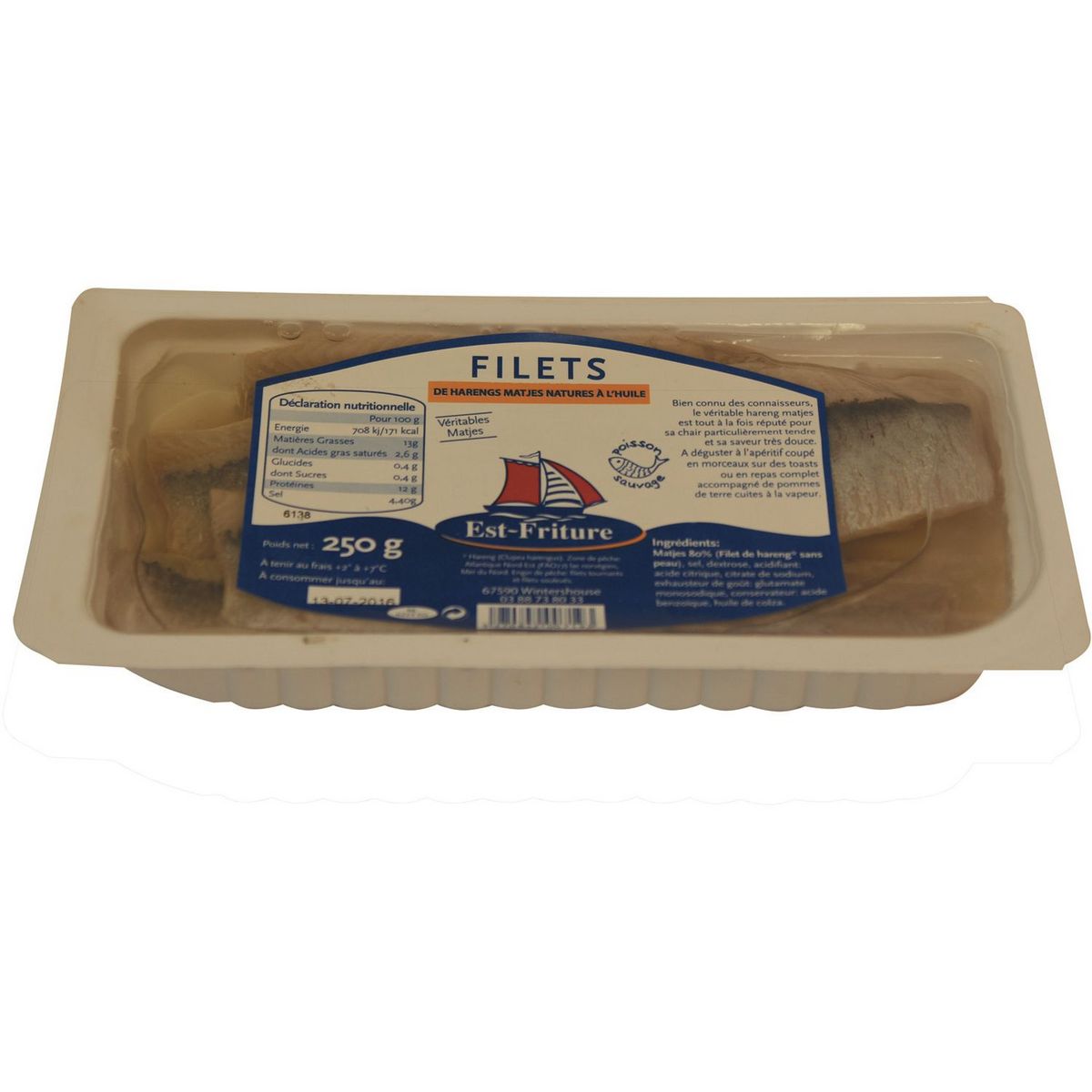 Matjes 80 % (filets de HARENGS sans peau (clupea harengus) pêché en Atlantique Nord Est FAO 27 (Mer du Nord, Lac Norvégien) à l'aide de filets tournants et filets soulevés, sel, dextrose, acidifiant: acide citrique, citrate de sodium, exhausteur de goût: glutamate monosodique, conservateur: acide benzoïque, huile de colza