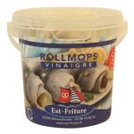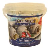Ingrédients : Rollmops (Filets de HARENGS (Clupea harengus pêché en Atlantique Nord Est FAO 27 ), cornichon) eau, vinaigre d'alcool, sel, sucre, oignons, graines de MOUTARDE, arômes naturels