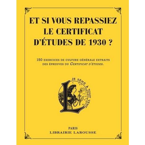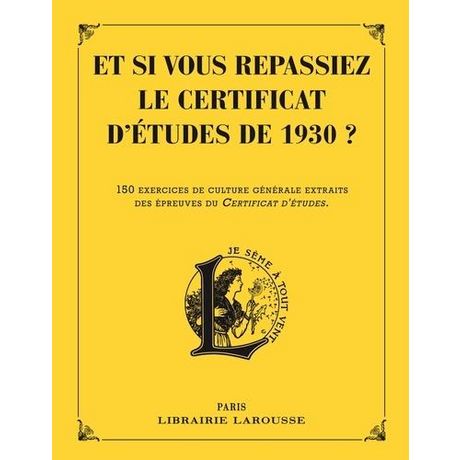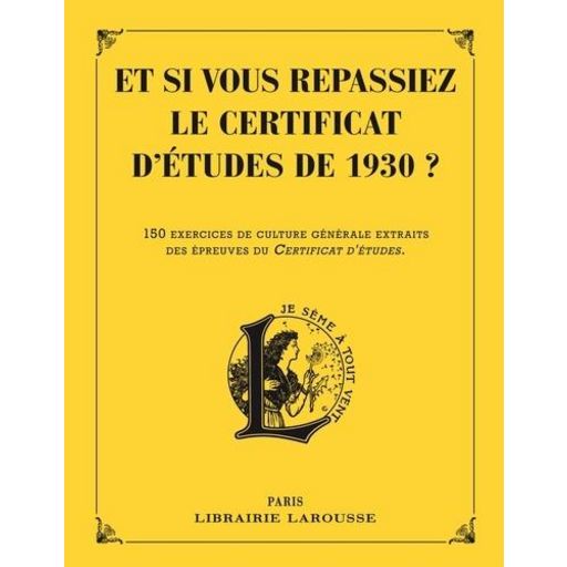 Pour être 1er de la alte, il fallait être bon en tout. En témoignent des manuels Larousse de préparation au certificat d'étude des années 1930 dont sont extraits les exercices réunis dans ce cahier. Au programme : - français : dictées (avec fautes ou à trous), questions de vocabulaire, de grammaire, exercices de style - maths : résolution de problèmes de temps, de surfaces, de capacités, de prix d'achat et de revient - histoire : dates des événements, identification de personnages, de lieux - géographie : noms des capitales, numéros des départements, localisation de chefs-lieux - sciences : questions de sciences naturelles, de chimie, expériences - matières diverses : dessin, musique, récitation, enseignement ménager (pour les filles), enseignement agricole (pour les garçons) L'ouvrage est composé de 4 séquences d'épreuves dans ces 6 matières. Avec un barème et des corrigés pour s'auto-évaluer.