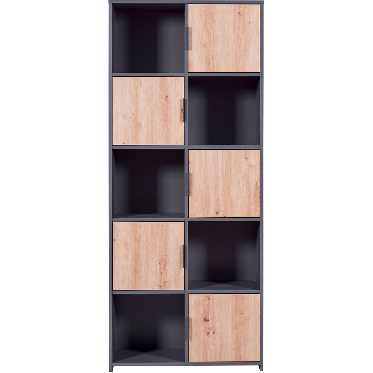 L'étagère TEO, décor gris anthracite et chêne artisan, offre un rangement modulable et élégant. Avec 5 portes et 5 niches, elle est idéale pour livres, décorations ou jouets. Les compartiments fermés protègent de la poussière, tandis que les niches ouvertes facilitent l'accès et la mise en valeur d'objets. Les portes modulables, adaptables à chaque niche, permettent une personnalisation selon vos besoins. Parfaite pour organiser votre espace de vie, elle s'intègre harmonieusement dans une chambre d'enfant, un salon ou un bureau. Durable et facile à entretenir, elle est conçue en panneaux de particules mélaminés avec des poignées en PVC.