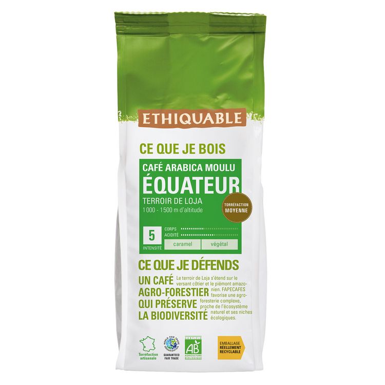 CE QUE JE BOIS : Ce café d'Équateur, équitable et bio, est cultivé en haute altitude de 1000 à 1500 m sur le terroir de Loja. Il propose une belle harmonie suave et équilibrée, aux notes végétales et de sucre roux.