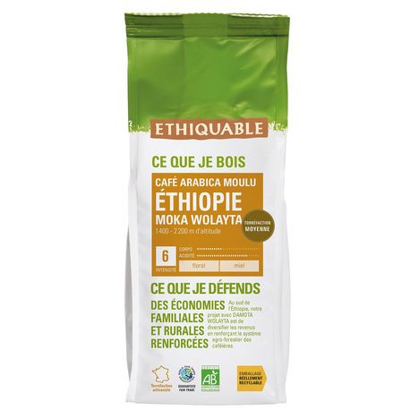 CE QUE JE BOIS : Issu des hautes terres éthiopiennes, ce café arabica bio moulu provient du terroir de Wolayta, une région reconnue pour ses mokas floraux et raffinés.