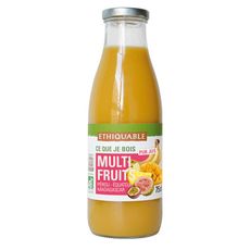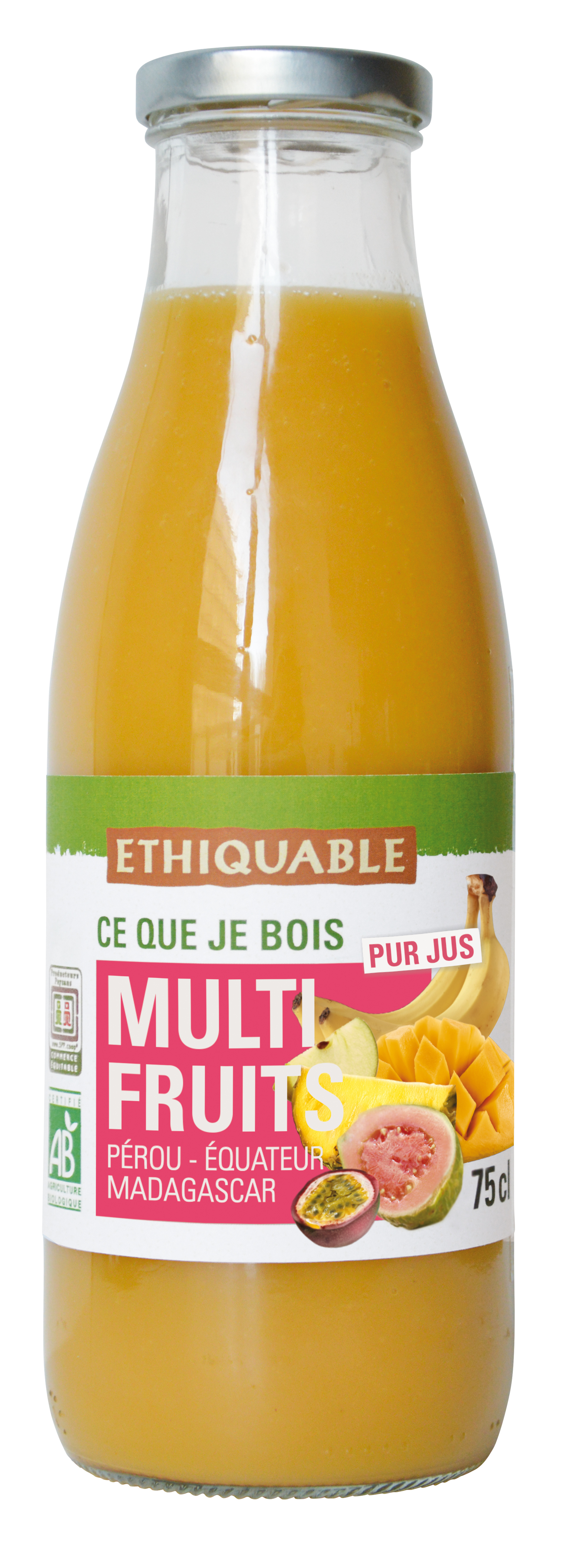 PUR JUS MULTIFRUITS BIO ETHIQUABLE 75 CL Ce que je défends : UN PRIX JUSTE - Nous définissons avec 6 coopératives d'Equateur, de Madagascar et du Pérou, un prix équitable qui couvre les coûts de production et qui permet aux producteurs d'investir pour leur communauté.