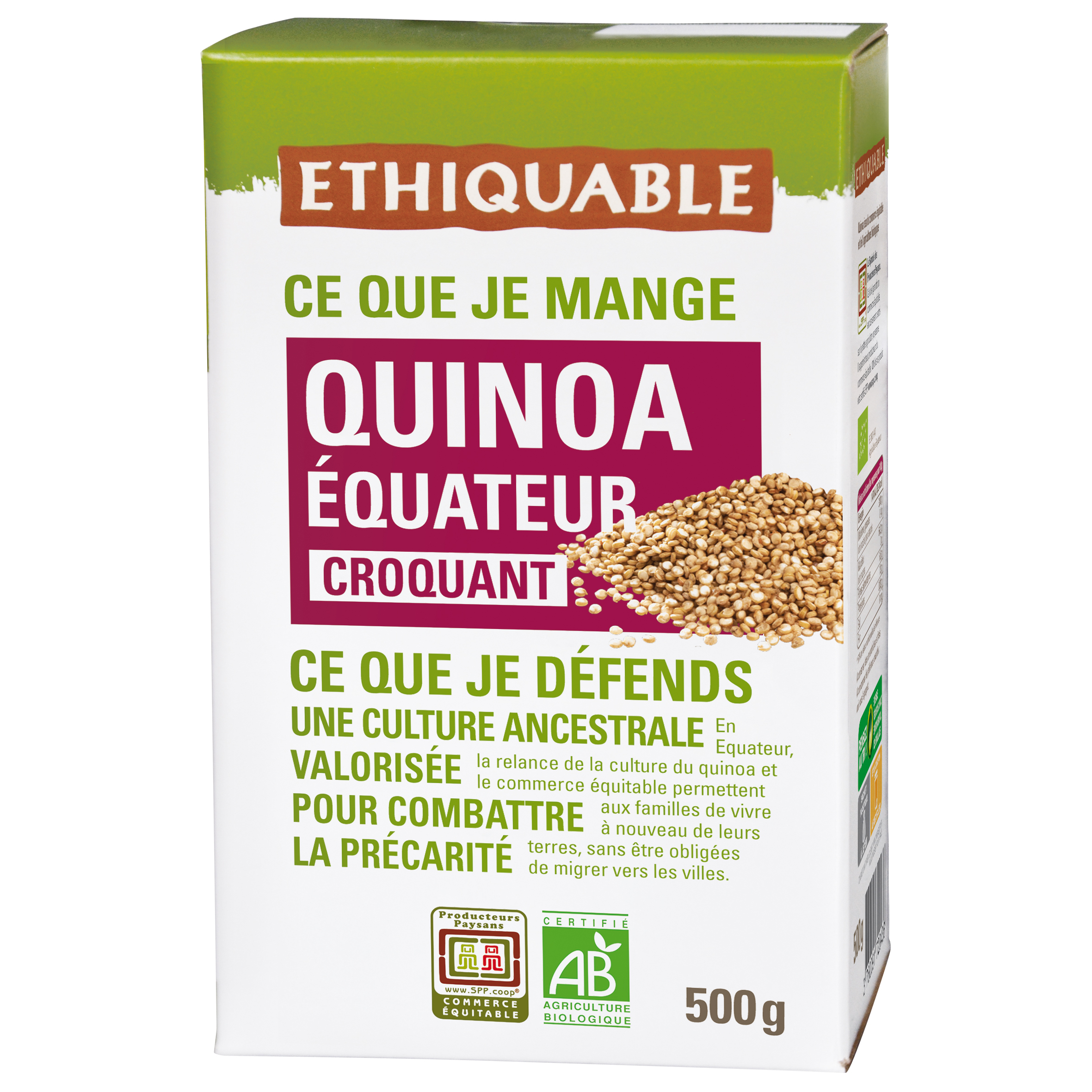 CE QUE JE MANGE : Cultivé à haute altitude dans les Andes équatoriennes, ce quinoa bio et équitable appartient à la variété traditionnelle "type Valle", réputée pour son grain ferme, sa belle tenue à la cuisson et sa légère note de noisette. Son croquant naturel en fait un ingrédient idéal pour vos salades, bowls, plats chauds ou accompagnements végétariens. Il est naturellement riche en protéines végétales, fibres, fer et autres minéraux essentiels. Issu d’une filière paysanne équitable, ce quinoa contribue à la préservation de la biodiversité locale et au maintien des savoir-faire agricoles andins.