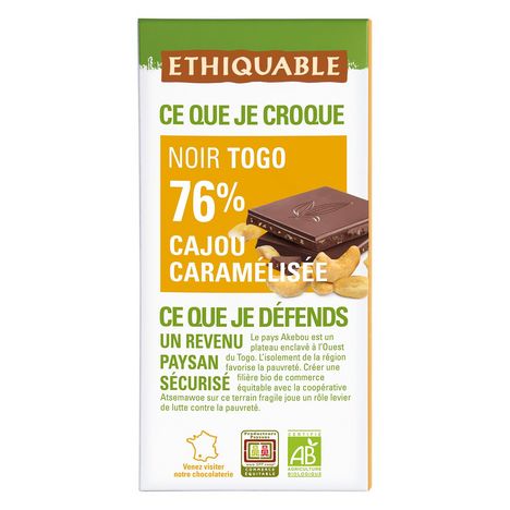 CHOCOLAT NOIR 76% CAJOU CARAMÉLISÉE TOGO BIO 100G